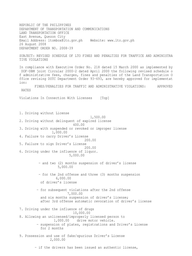 Revised Schedule Of Lto Fines And Penalties For Traffice And Administra Tive Violations Traffic Transport